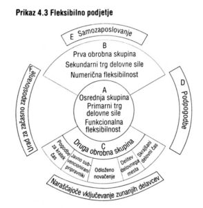 Fleksibilnost se pojavlja v dveh oblikah, kot funkcionalna fleksibilnost, ta pomeni zaposlovanje večstransko kvalificiranih delavcev, ki lahko delajo na različnih področjih. Ti delavci tvorijo središče delovne sile, imajo redno zaposlitev in zagotovljeno delovno mesto. Druga pa je numerična fleksibilnost, to tvorijo obrobne skupine, ki ne uživajo enake stopnje varnosti zaposlitve, nanaša pa se predvsem na zmožnost podjetja, da po potrebi poveča ali zmanjša obseg delovne sile. Bolj kot so delavci oddaljeni od središča, manj prednosti bodo lahko uživali.[2]