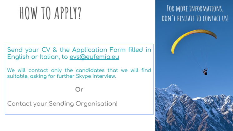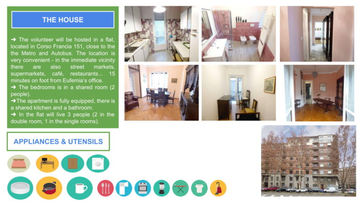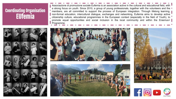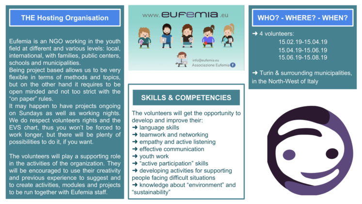 Organizacija Associazione EUfemia (spletna stran, FB) išče prostovoljca/-ko za dvomesečni projekt prostovoljstva, ki bo trajal od 15. 4. do 15. 6. 2019 v Italiji (Torino).