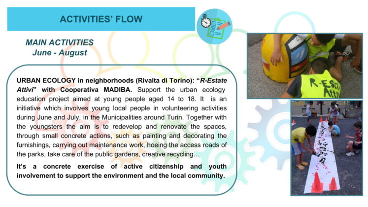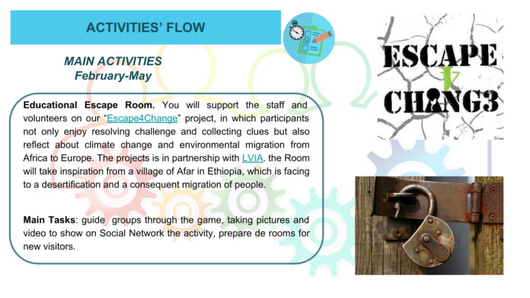 Prostovoljno delo bo zajemalo pomoč pri organizaciji interaktivne igre Escape Room z namenom ozaveščanja mladih o okoljski problematiki. Vsem sodelujočim bodo kriti stroški prebivališča, hrane, prevoza in tečaja italijanskega jezika. Projekt je namenjen vsem, ki jih zanima delo z mladimi ter si želijo pridobiti nove izkušnje in znanja na področju ekologije, trajnostnega razvoja, pravične trgovine in organizacije.